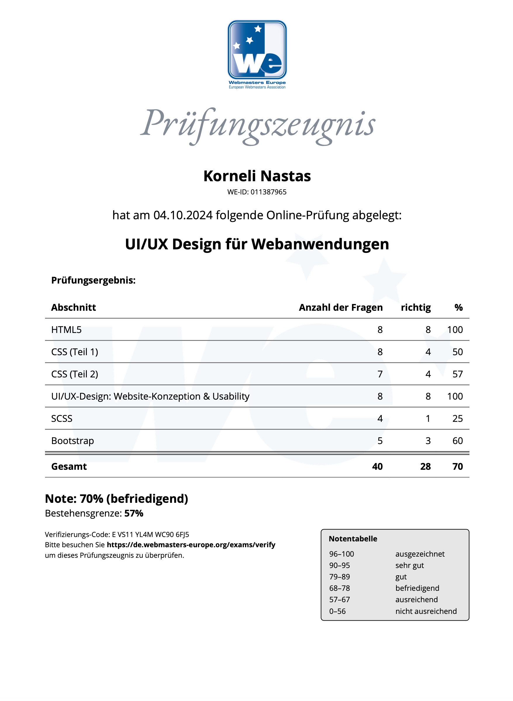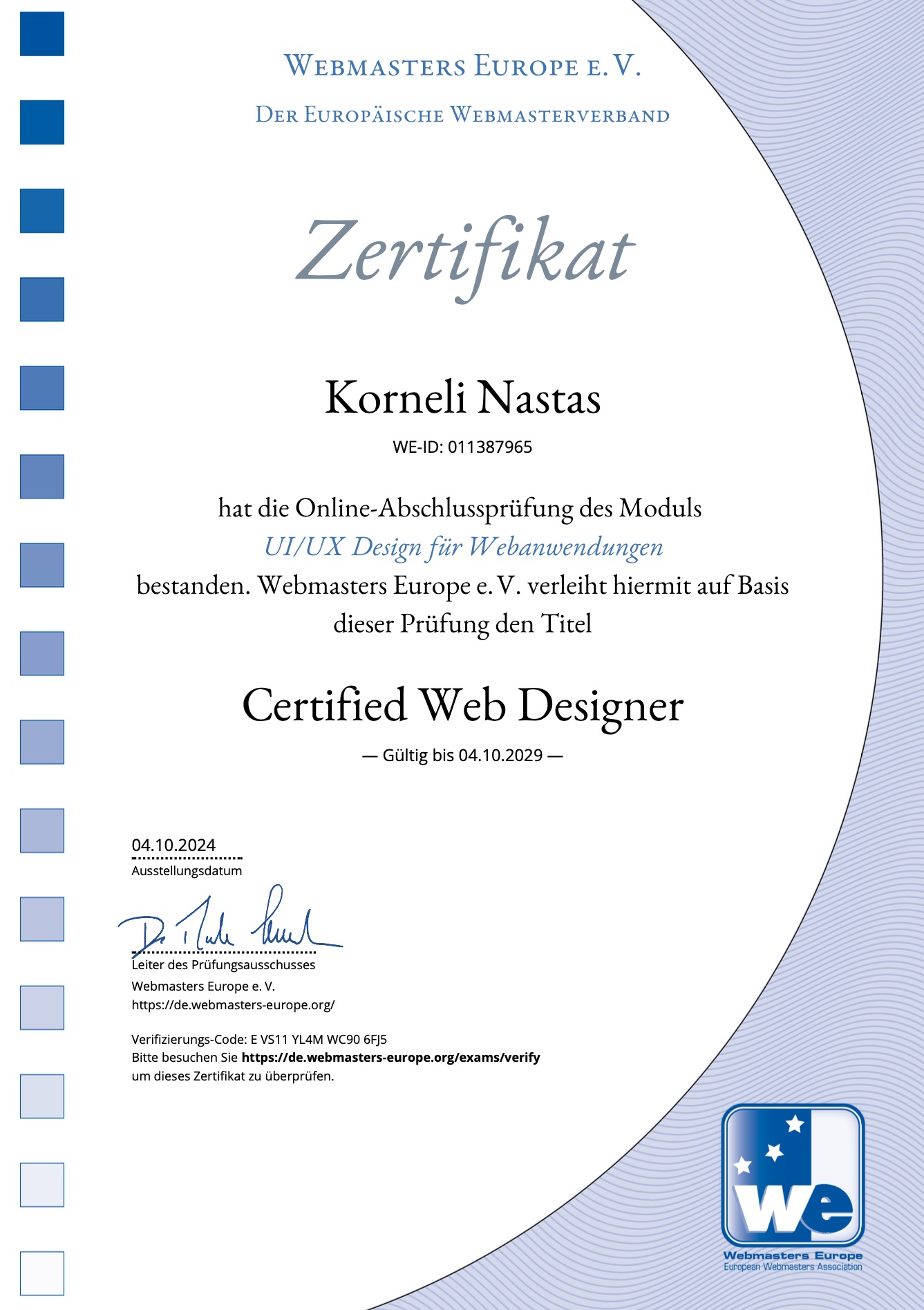 Certificate - UI/UX Design for Web Applications - Webmasters Europe e.V.