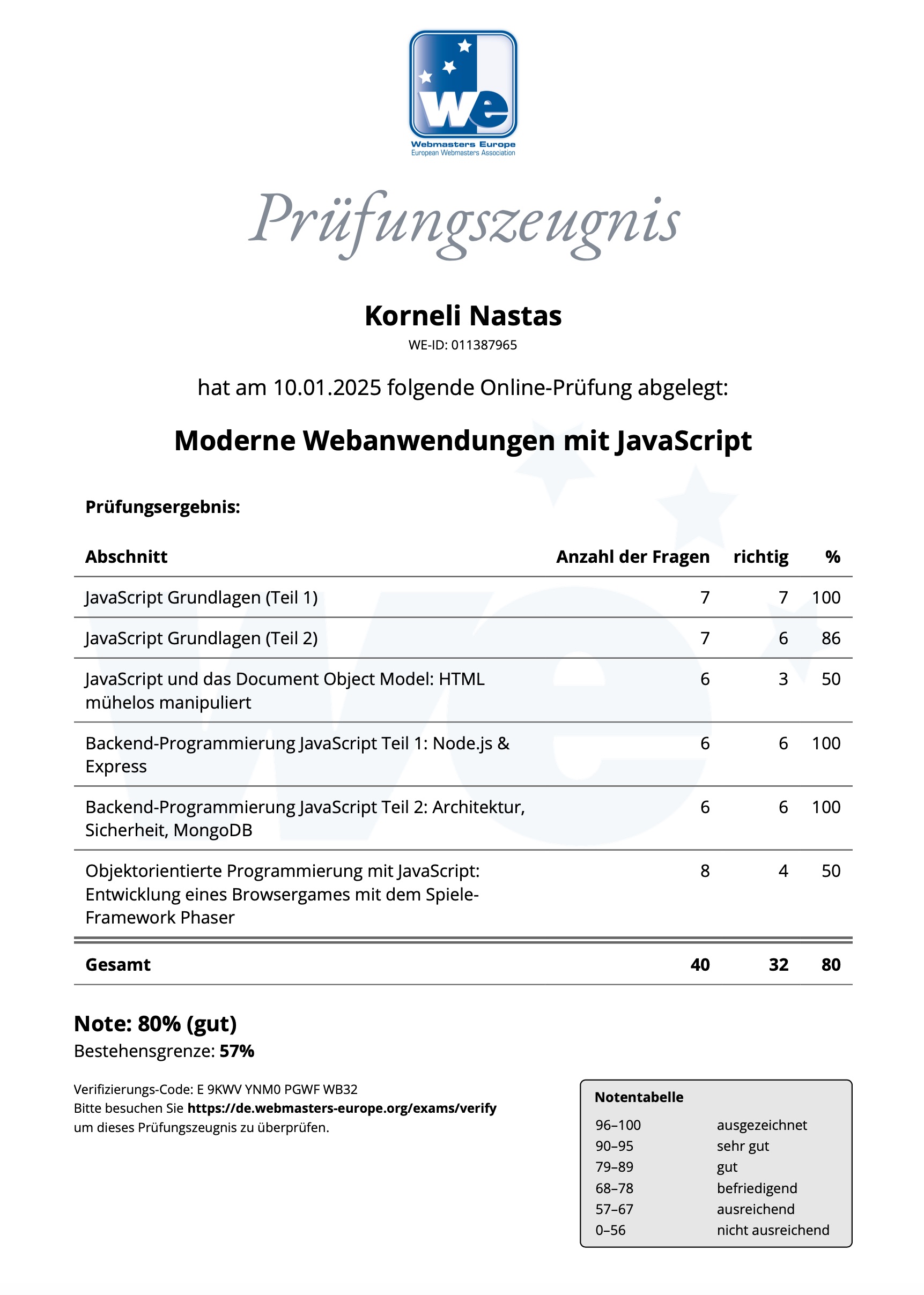 Certificate - Web Appl with JavaScript - Webmasters Europe e.V.